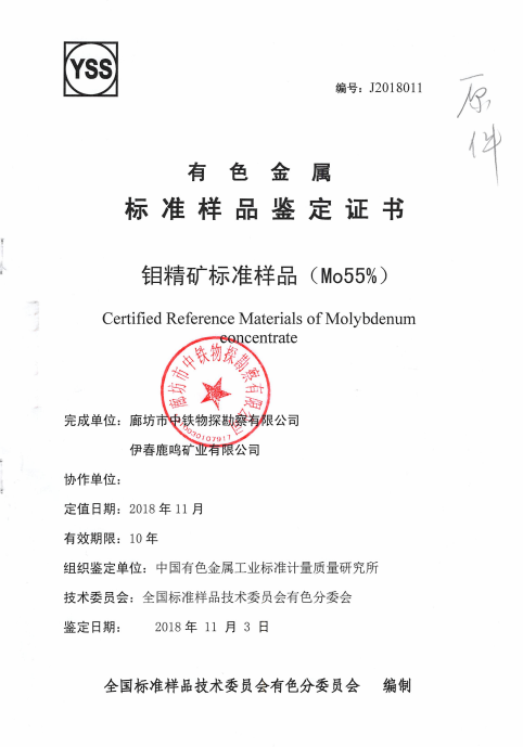 鉬精礦國家標(biāo)準(zhǔn)樣品鑒定證書及實(shí)物